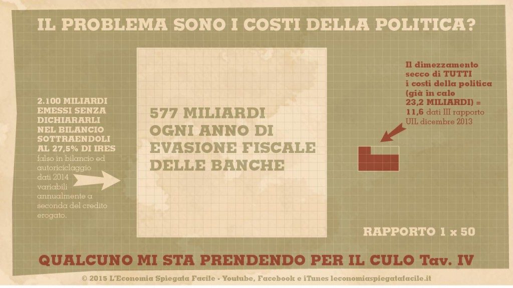 È giunto il momento dunque di svelare il nome delle ultime tre navi appena disposte sul piano di gioco battenti la bandiera dell’evasione e dell’elusione fiscale. Esse sono: elusione IMU da parte della Chiesa 24 miliardi(esattamente la stessa cifra sparita con MPS ma costante tutti gli anni), evasione ed elusione fiscale delle corporations (ad esempio Facebook, Apple, Google, ecc.) 27 miliardi, evasione fiscale delle banche 577 MILIARDI (44% sul PIL) risultanti dal mancato inserimento nella colonnina degli attivi del bilancio della voce “emissione di nuova moneta”, il che produce di fatto i reati di falso in bilancio ed auto riciclaggio.
