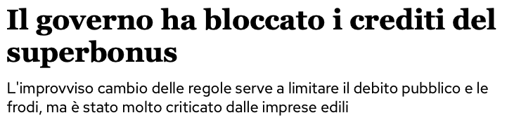 - Draghi 5: fermo la circolazione dei crediti fiscali perché il Superbonus è un disastro per i conti pubblici (cioè ha migliorato il rapporto debito/PIL italiano del 10% in soli due anni), sempre per salvare l’Italia dal fallimento e per ridurre il debito pubblico;