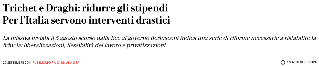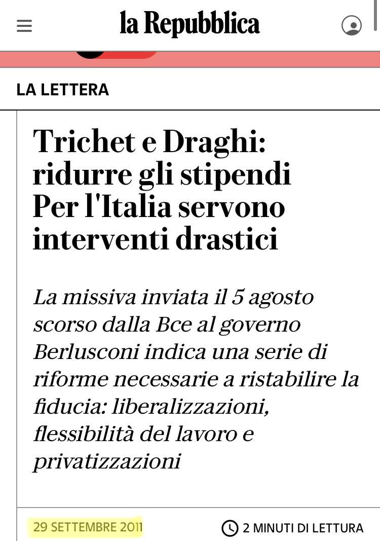 - Draghi 3: faccio un colpo di Stato in Italia scrivendo una lettera segreta dalla BCE al Presidente del Consiglio italiano in cui gli dico che se non taglia altri costi e non impone leggi che riducano i salari dei lavoratori, per salvare di più l’Italia e rilanciare meglio l’economia, lo mando a casa.
